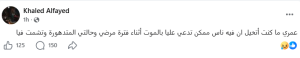 وكتب خالد الفايد في أول تعليق منه بعد الأزمة الصحية، عبر حسابه الشخصي بموقع فيس بوك: «عمري ما كنت أتخيل إن فيه ناس ممكن تدعي عليا بالموت».
