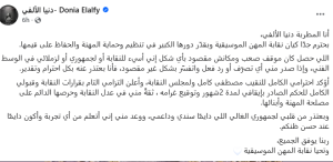 كتبت دنيا الألفي في منشور عبر حسابها الرسمي بموقع فيس بوك: «أنا المطربة دنيا الألفي.. بحترم جدًا كيان نقابة المهن الموسيقية وبقدّر دورها الكبير في تنظيم وحماية المهنة والحفاظ على قيمها».
