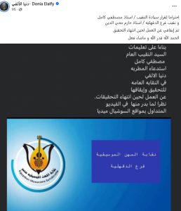 وكتبت دنيا الألفي في أول تعليق منها، بمنشور عبر حسابها الشخصي بموقع فيس بوك: «احترامًا لقرار سيادة النقيب مصطفى كامل ونقيب فرع الدقهلية حازم محي الدين تم إيقافي عن العمل».