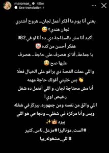 كتبت مي عمر في منشور عبر خاصية الستوري التابعة لحسابها الرسمي بموقع انستجرام: «يعني أنا يوم ما أفكر أعمل لجان.. هروح أشتري لجان هندي؟».