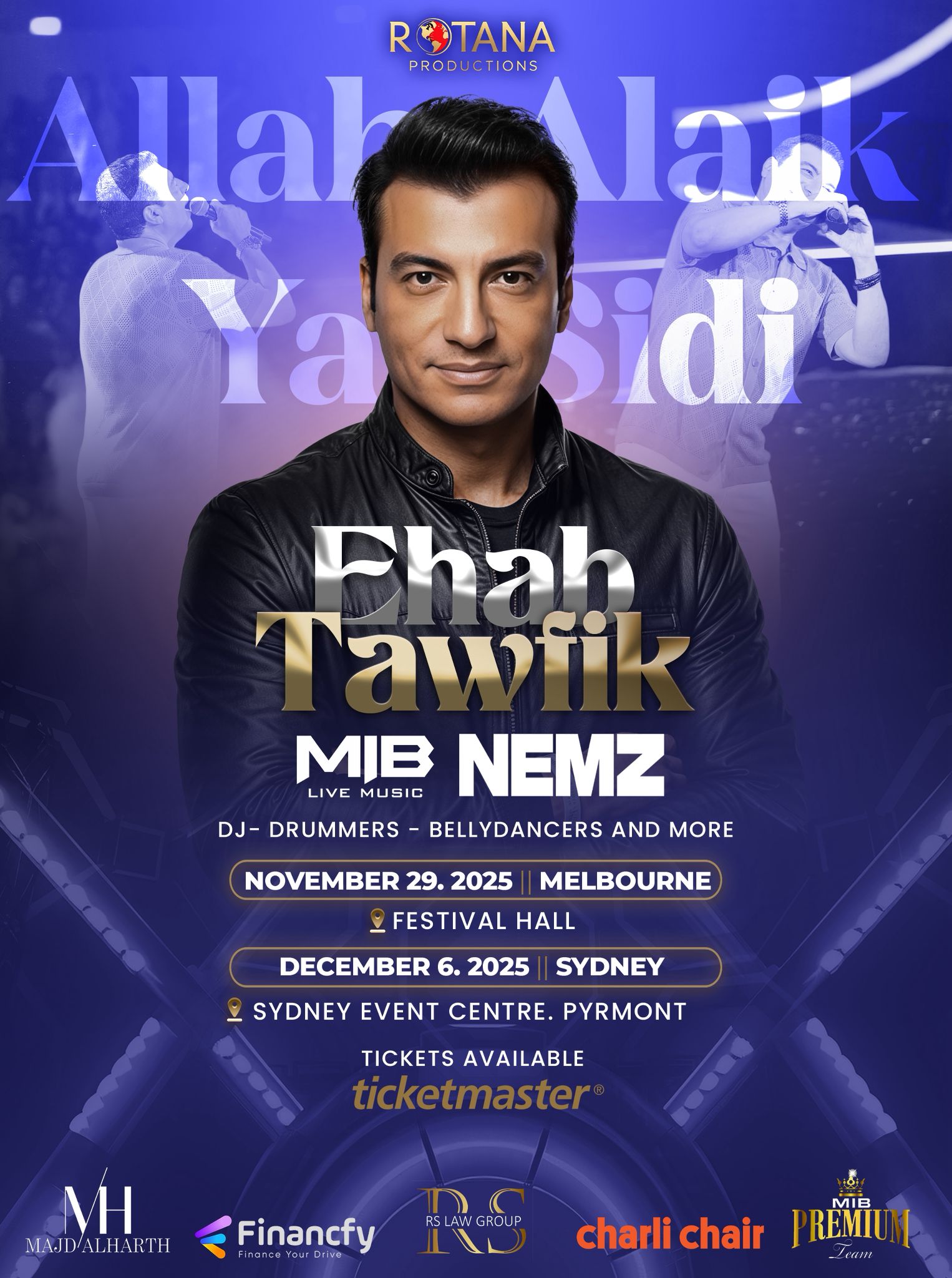 ويأتي الحفلان بتنظيم روتانا برودكشنز، المتخصصة في تنظيم الفعاليات الغنائية للجاليات العربية والمصريين في أستراليا وأوروبا. وشهد الحفلان إقبالًا جماهيريًا غير مسبوق دفع المنظمين لاستئجار ملاعب كرة قدم كبيرة لاستيعاب أعداد الحضور الذين حجزوا التذاكر.
