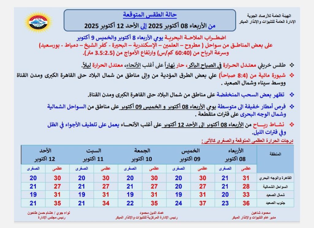 أعلنت الهيئة العامة للأرصاد الجوية عن حالة الطقس المتوقعة في مصر خلال الفترة من الأربعاء 8 أكتوبر حتى الأحد 12 أكتوبر 2025، حيث تشهد البلاد تقلبات جوية ملحوظة على بعض المناطق الساحلية.
