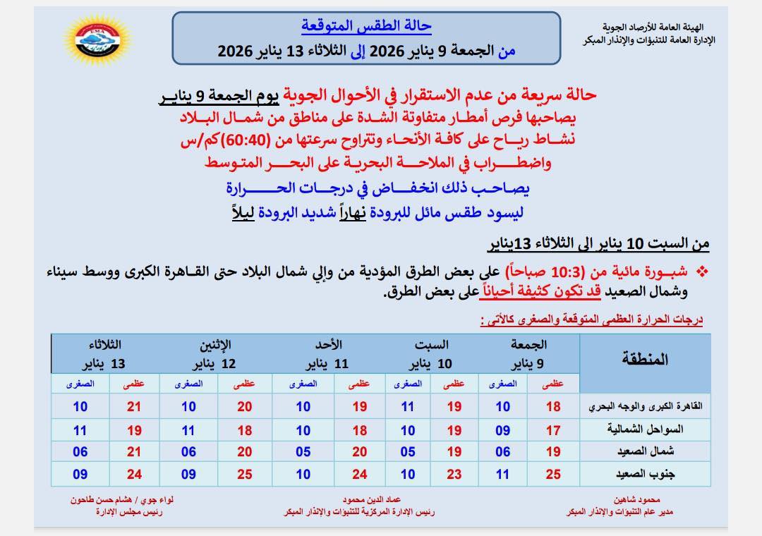 حذرت الهيئة العامة للأرصاد الجوية من حالة سريعة من عدم الاستقرار في الأحوال الجوية تبدأ اعتبارًا من يوم الجمعة 9 يناير 2026 وتستمر حتى الثلاثاء 13 يناير، يصاحبها سقوط أمطار متفاوتة الشدة، ونشاط قوي للرياح، وانخفاض ملحوظ في درجات الحرارة على أغلب أنحاء البلاد.