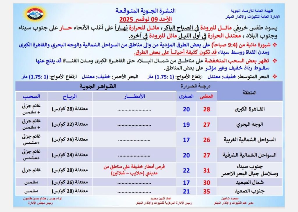 وأوضحت الأرصاد أن الطقس سيكون مائلًا للبرودة في الصباح الباكر، بينما يميل للحرارة نهارًا على أغلب الأنحاء، ويكون حارًا على جنوب سيناء وجنوب البلاد، ثم يتحول إلى معتدل في أول الليل ومائل للبرودة في آخره.شبورة مائية على الطرق