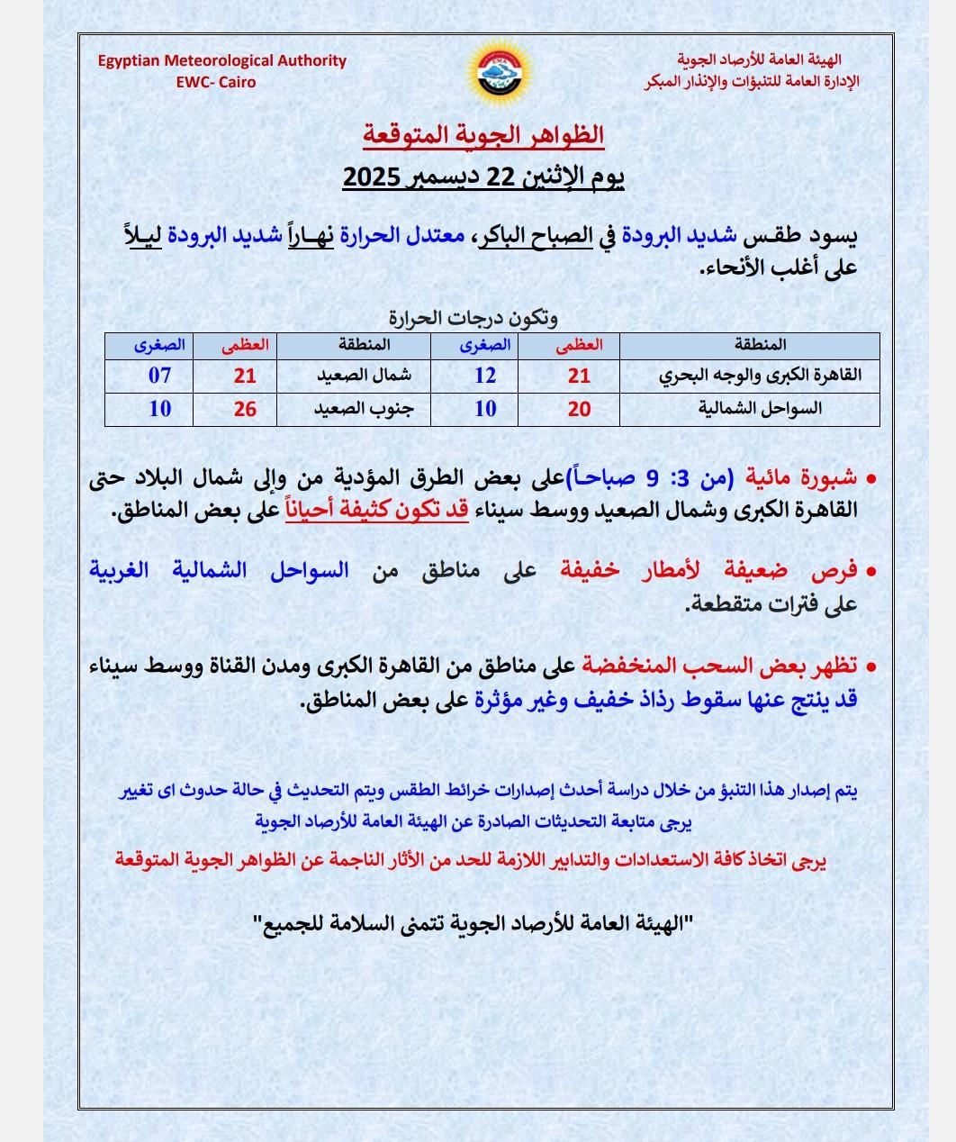 أعلنت الهيئة العامة للأرصاد الجوية توقعاتها لحالة الطقس يوم الإثنين 22 ديسمبر 2025، مشيرة إلى أن البلاد ستشهد طقسًا شديد البرودة في الصباح الباكر وليلاً، بينما يكون معتدل الحرارة نهارًا على أغلب الأنحاء.