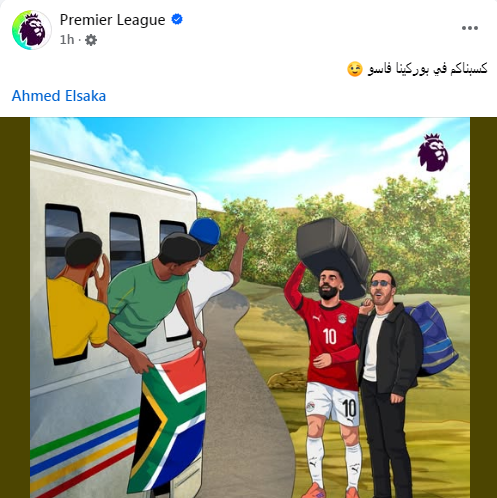 علق الحساب الرسمي للدوري الإنجليزي الممتاز على مواجهة منتخب مصر وجنوب إفريقيا المقبلة في كأس أمم إفريقيا 2025، بنشر صورة تجمع الفنان أحمد السقا بمواطنه محمد صلاح.