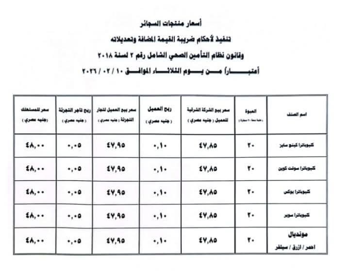 أسعار السجائر الشعبية اعتبارًا من 10 فبراير 2026:
