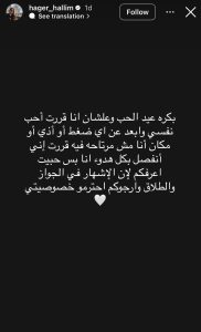 كتبت هاجر حليم في منشور عبر خاصية الستوري التابعة لحسابها الرسمي بموقع انستجرام: «عيد الحب وعلشان أنا قررت أحب نفسي وأبعد عن أي ضغط أو أذى أو مكان أنا مش مرتاحة فيه قررت إني أنفصل بكل هدوء».