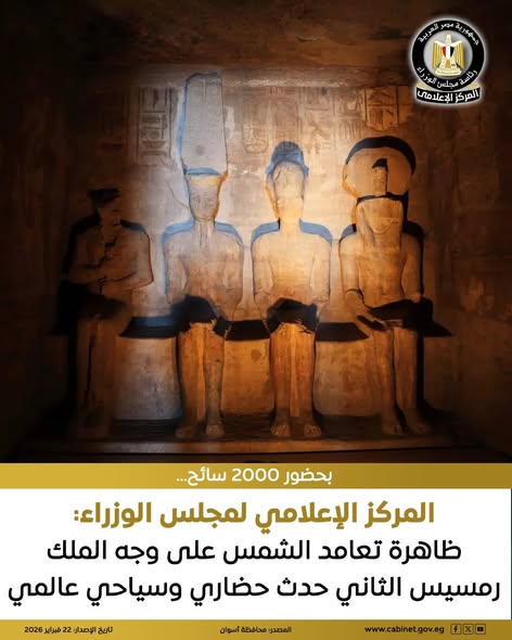 نشر المركز الإعلامي لمجلس الوزراء بيانًا عبر منصاته على مواقع التواصل الاجتماعي، أكد خلاله أنه تم صباح اليوم الأحد الموافق 22 فبراير، تنظيم الفعاليات الخاصة بظاهرة تعامد الشمس على وجه الملك رمسيس الثاني، وفقًا لكافة الترتيبات والضوابط المتبعة لهذا الحدث.