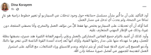واختتمت: «وأدعو الجميع إلى تحري الدقة فيما يُنشر أو يتم تداوله، وعدم الانسياق وراء الشائعات، مع التأكيد على استمرار العمل لتقديمه للجمهور في أفضل صورة ممكنة بإذن الله».