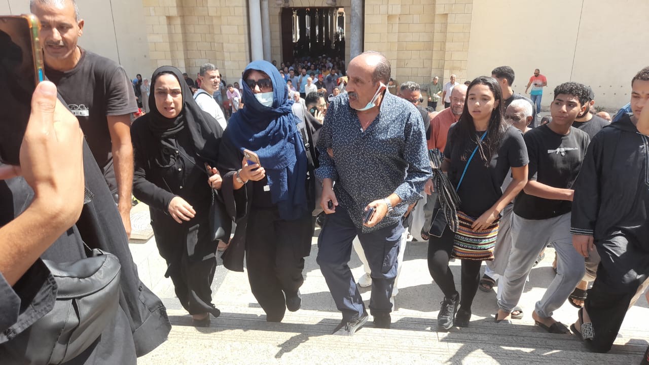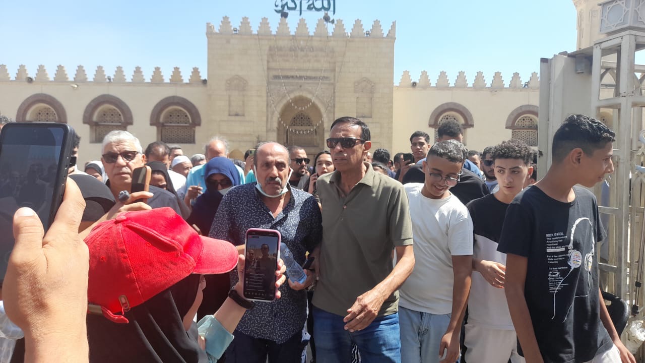 دموع أحمد صيام في جنازة شقيقته نادية بمسجد عمرو بن العاص