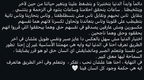 وكتبت لقاء الخميسي: دائماً وأبداً الدنيا بتختبرنا وبتضغط علينا وبتغير حياتنا من حين لآخر وبتلخبطنا، ساعات بنحقق أحلامنا وساعات بنتوه في الزحمة وننسى، بنقابل ناس نحبهم وناس مش بتستلطفنا، وناس بتحاربنا وناس تطبطب على قلوبنا، وناس بتحاول تكسرنا لأنهم نفسهم مكسورين ومش عارفين يصدقوا في نفسهم، حتى وهم ناجحين وبيحققوا اللي قرروا يعملوه.