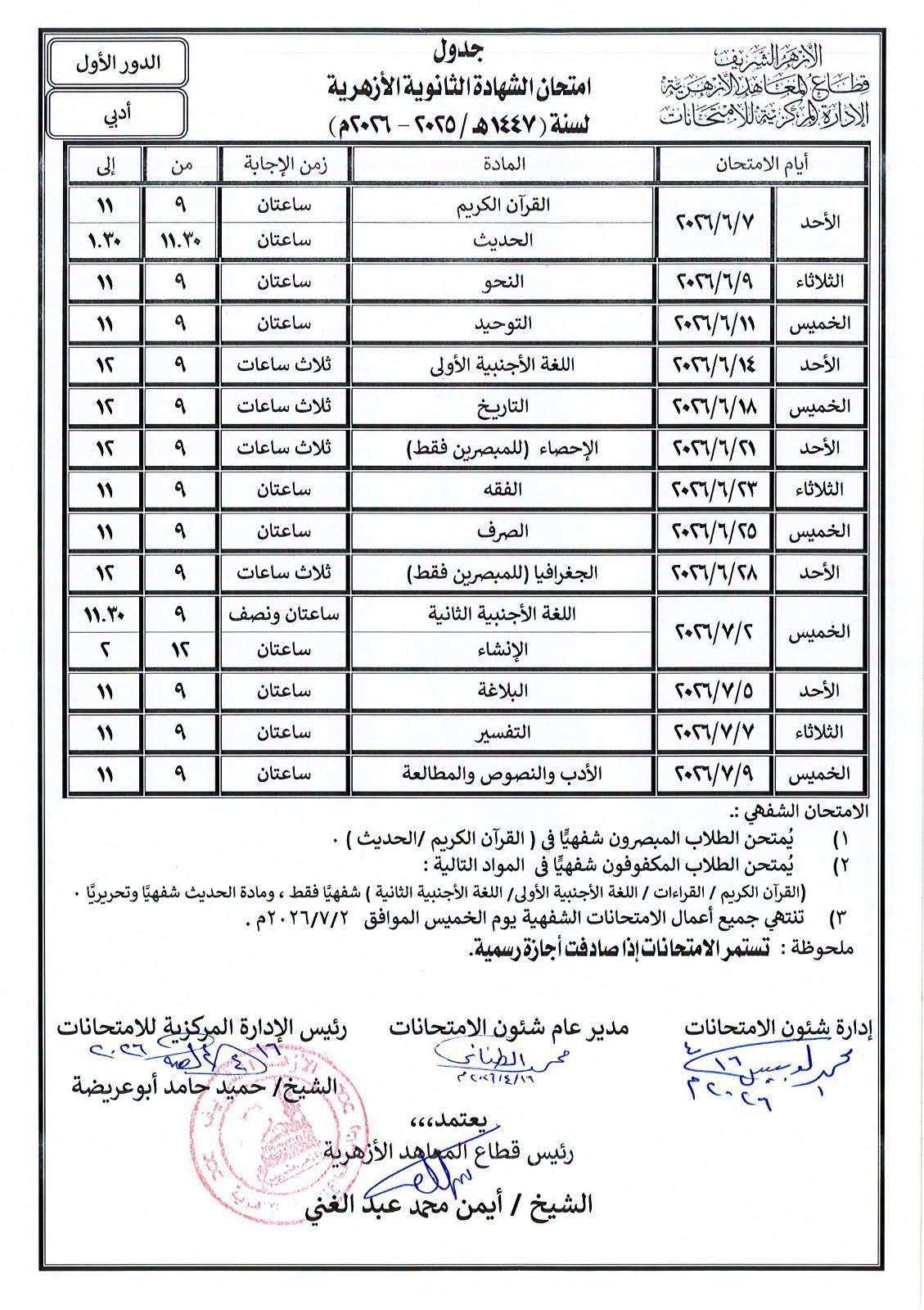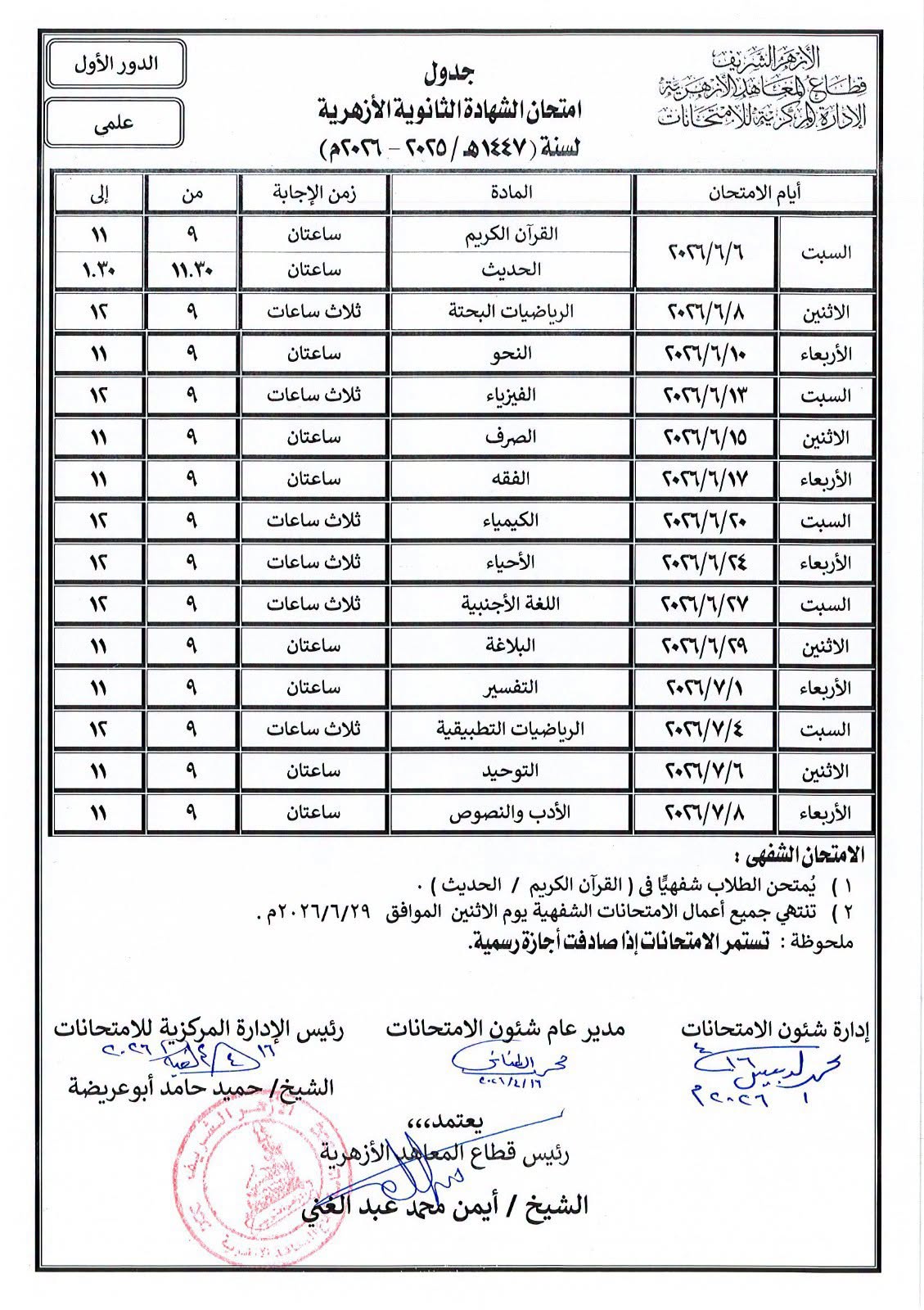 أعلن قطاع المعاهد الأزهرية، اليوم السبت 18 أبريل 2026، اعتماد جداول امتحانات الشهادة الثانوية الأزهرية للدور الأول للعام الدراسي 2025/2026، بعد الانتهاء من إعدادها بشكل كامل من الجهات المختصة.
