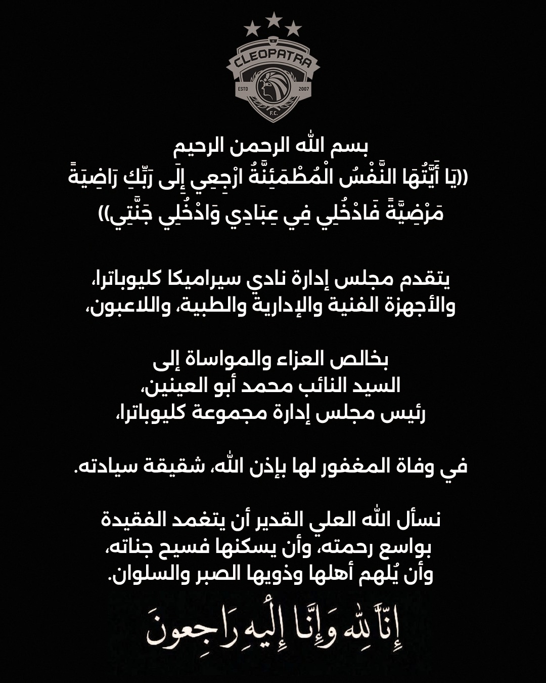تقدم مجلس إدارة نادي سيراميكا كليوباترا، والأجهزة الفنية والإدارية والطبية، واللاعبون، بخالص العزاء والمواساة إلى النائب محمد أبو العينين، رئيس مجلس إدارة مجموعة كليوباترا، في وفاة المغفور لها بإذن الله، شقيقته.