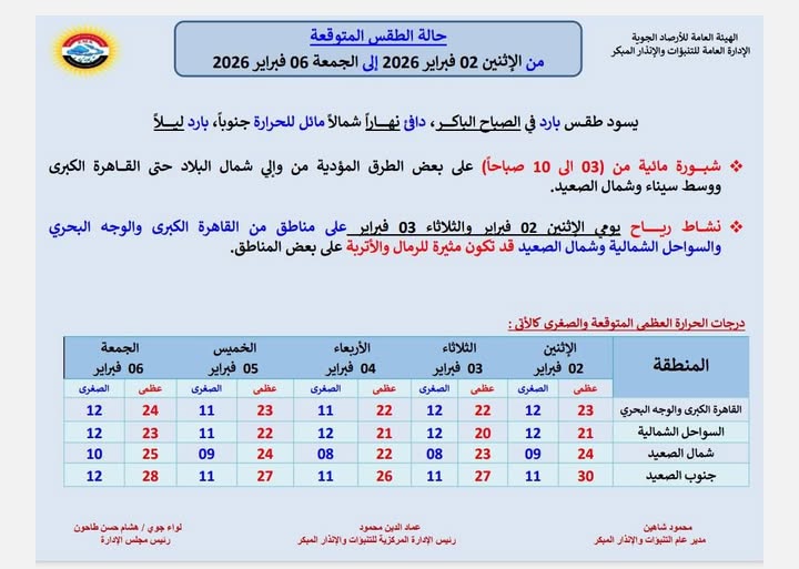 توقعت الهيئة العامة للأرصاد الجوية، في نشرتها الأسبوعية، أن يسود طقس بارد في الصباح الباكر، ودافئ نهارًا شمال البلاد، ومائل للحرارة في جنوبها، مع برودة ليلية واضحة خلال الفترة من الإثنين 2 فبراير 2026 حتى الجمعة 6 فبراير 2026.