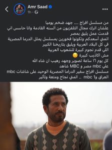 كتب عمرو سعد في منشور عبر حسابه الرسمي بموقع فيس بوك: 'من مسلسل إفراج.. جهد ضخم يوميًا.. علشان اترك مجال التلفزيون من السنة القادمة وأنا حاسس إني قدمت عمل يليق بمصر'.