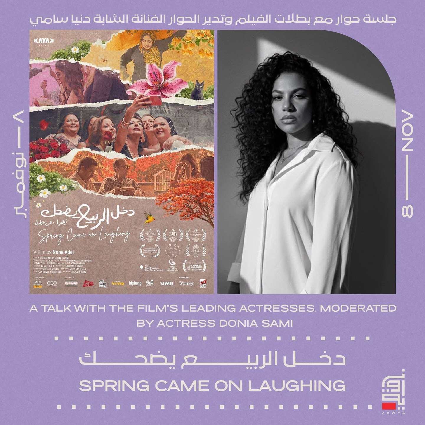 تستعد الفنانة دنيا سامي لإدارة ندوة خاصة عقب عرض فيلم «دخل الربيع يضحك» في سينما زاوية، غدًا السبت الموافق 8 نوفمبر الجاري، في تمام الساعة السادسة والنصف مساءً، بحضور بطلات العمل وعدد من صناعه ومحبي السينما المستقلة.