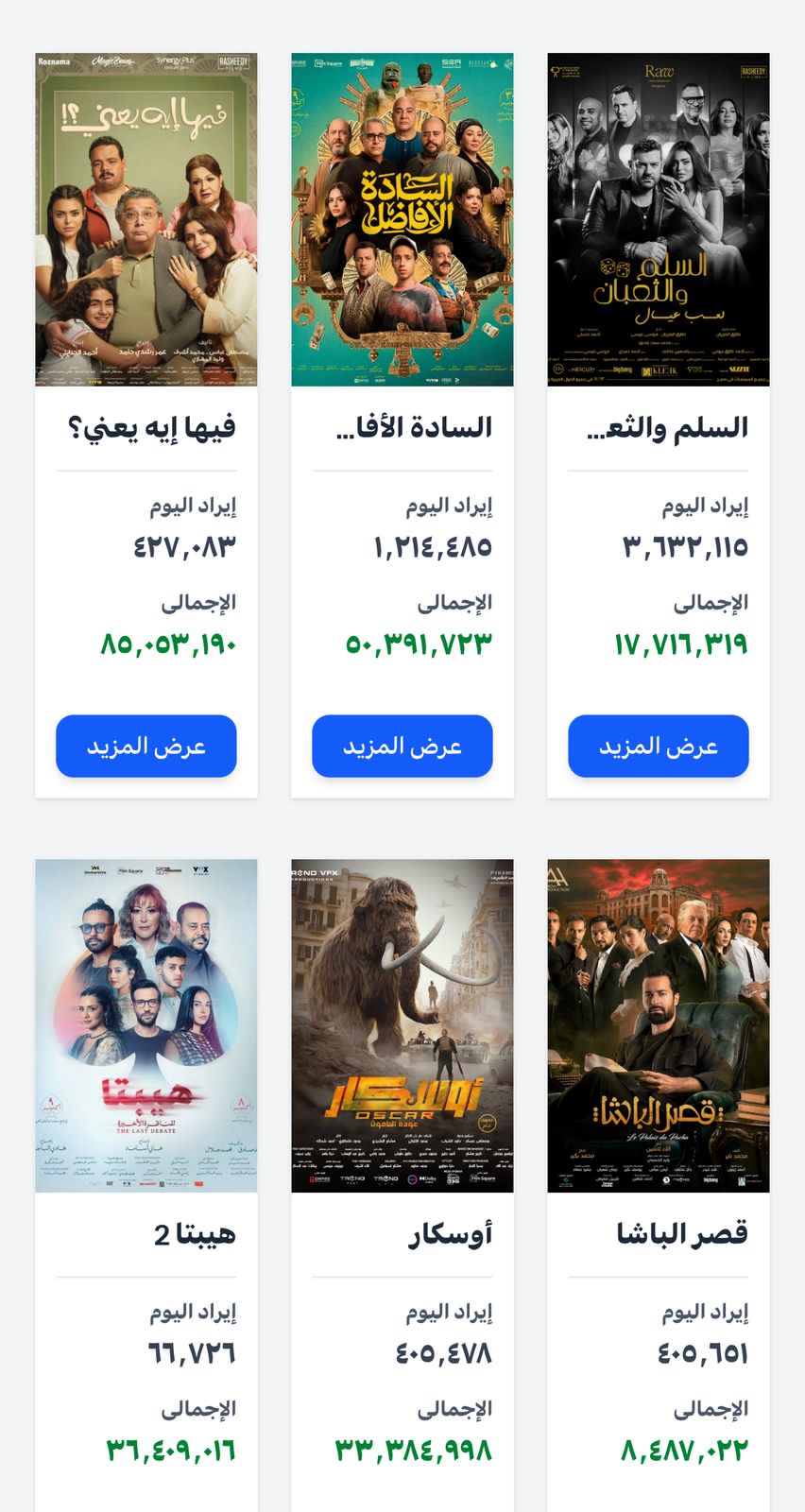 وجاءت باقي إيرادات الأفلام أمس كالتالي: 'السادة الأفاضل' مليون و214 ألف جنيه، 'فيها إيه يعني' 427 ألف جنيه، 'قصر الباشا' 405 آلاف و651 جنيهًا، 'أوسكار' 405 آلاف و478 جنيهًا، و'هيبتا ٢' 66 ألف و726 جنيهًا.