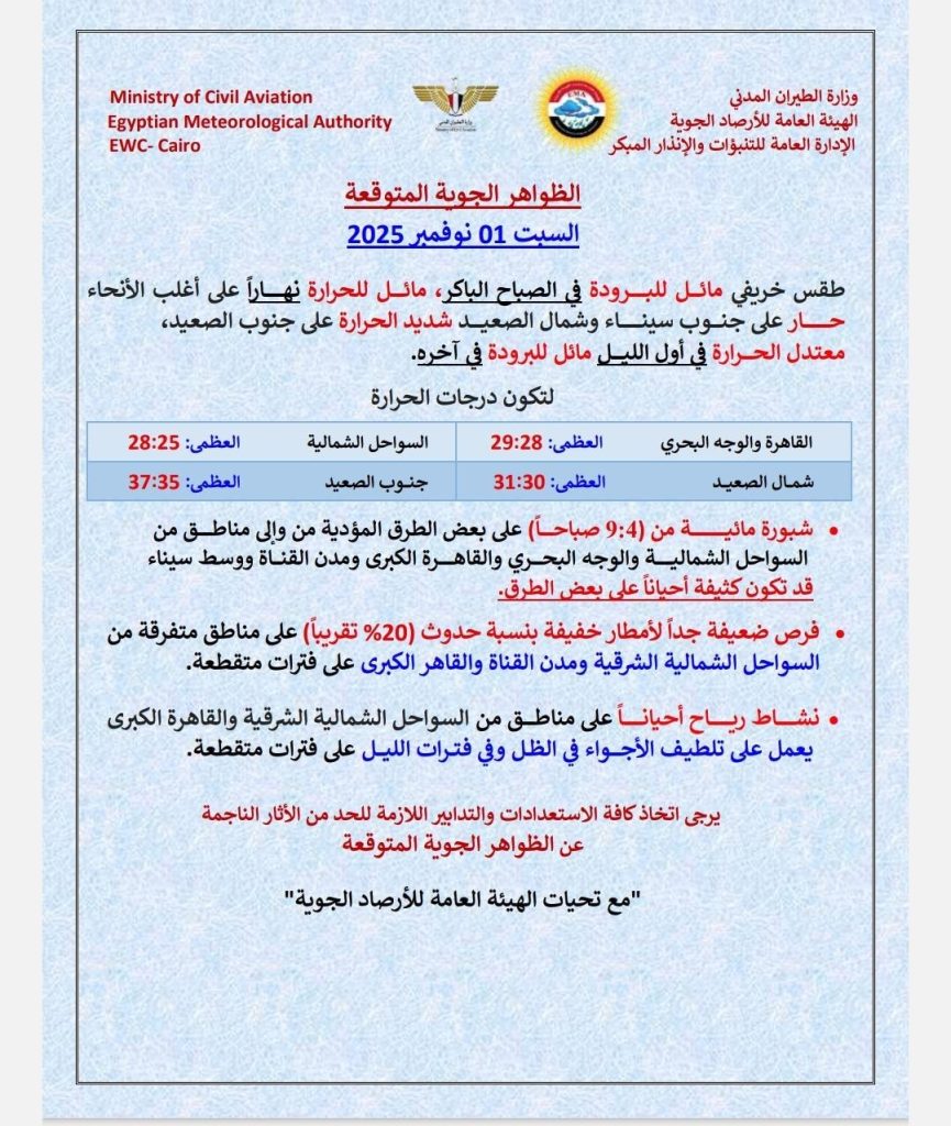 وحذرت الأرصاد من شبورة مائية كثيفة من الرابعة فجرًا وحتى التاسعة صباحًا على الطرق المؤدية إلى القاهرة الكبرى ومدن القناة والسواحل الشمالية، ما يستدعي الحذر أثناء القيادة خاصة مع توقع توافد أعداد كبيرة من الزائرين والسيارات في محيط المتحف المصري الكبير مع لحظة الافتتاح التاريخي.