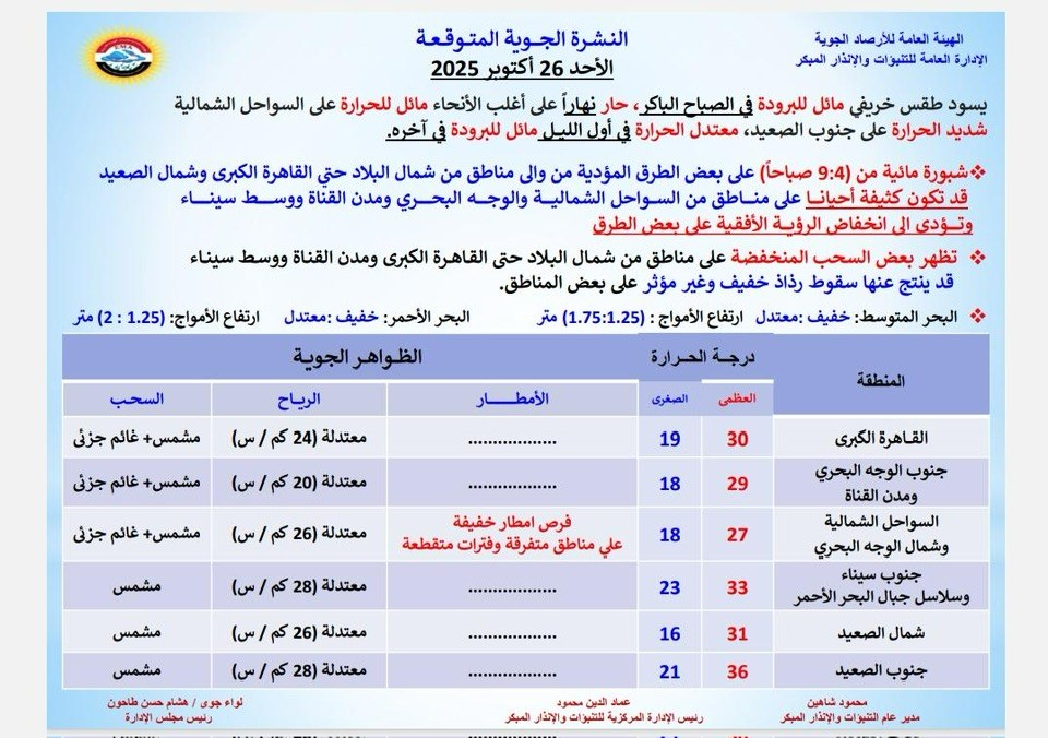 أصدرت الهيئة العامة للأرصاد الجوية، نشرتها الجوية التفصيلية ليوم الأحد الموافق 26 أكتوبر 2025، متضمنة تحذيرات هامة للمواطنين.