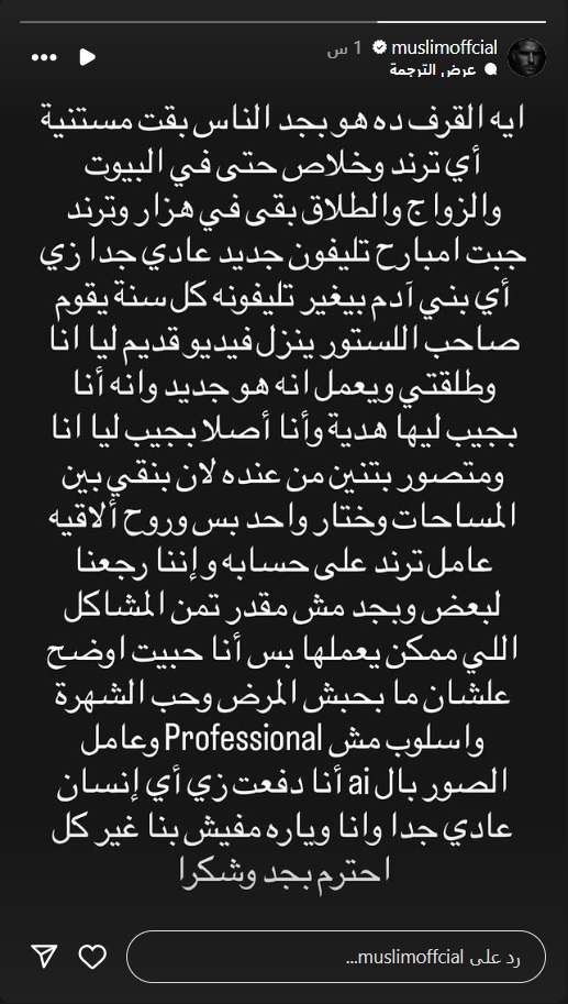 وأوضح المطرب مسلم أنه كان يقوم بشراء هاتف جديد لنفسه مثل أي شخص عادي، مؤكدًا أن أحد العاملين بالمحل استغل الموقف ونشر فيديو قديم على أنه جديد، بهدف جذب التفاعل وصنع 'ترند'، قائلاً:''جبت امبارح تليفون جديد عادي جدًا زي أي بني آدم بيغير تليفونه كل سنة يقوم صاحب الاستور ينزل فيديو قديم ليا أنا وطلقتي ويعمل أن هو جديد وأني بجيب ليها هدية.. وأنا أصلا بجيب ليا أنا، ومتصور بتنين من عنده لأن بنقي بين المساحات واختار واحد بس وروَّح ألاقيه عامل ترند على حسابه، وإننا رجعنا لبعض وبجد مش مقدر تمن المشاكل اللي ممكن يعملها'.