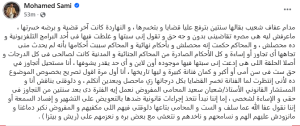 كتب محمد سامي في منشور عبر حسابه الرسمي بموقع فيس بوك: «مدام عفاف شعيب بقالها سنتين بترفع عليا قضايا وبتخسرها، والنهاردة كانت آخر قضية وبرضه خسرتها».