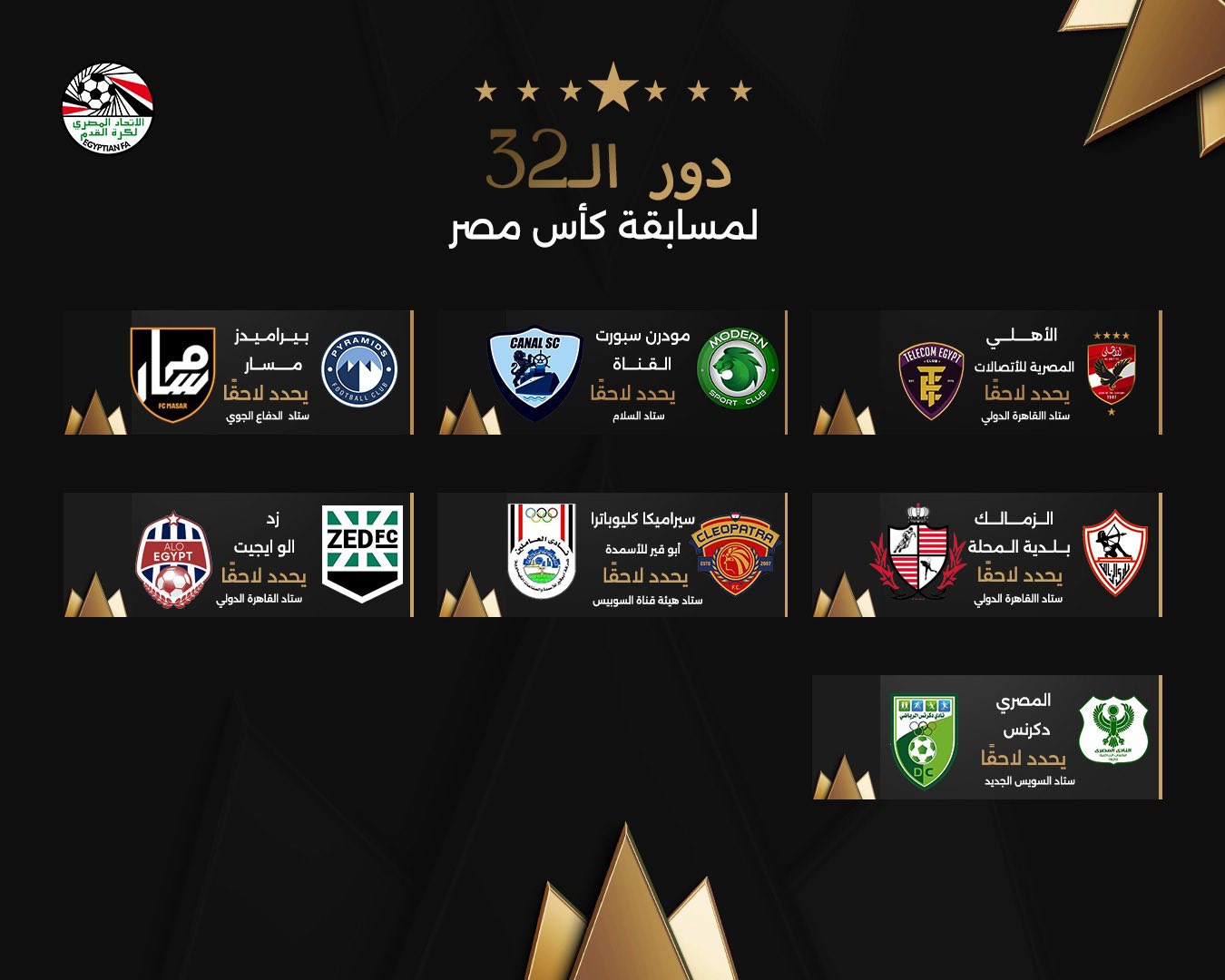 كشف اتحاد الكرة، عن مواعيد مباريات دور الـ32، دون تحديد موعد مباراة الأهلي والمصرية للاتصالات، الزمالك وبلدية المحلة، مودرن سبورت والقناة، بيراميدز ومسار، سيراميكا وأبو قير للأسمدة، زد وأليو إيجيبت، والمصري أمام دكرنس.
