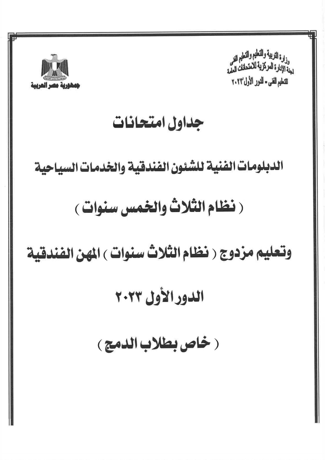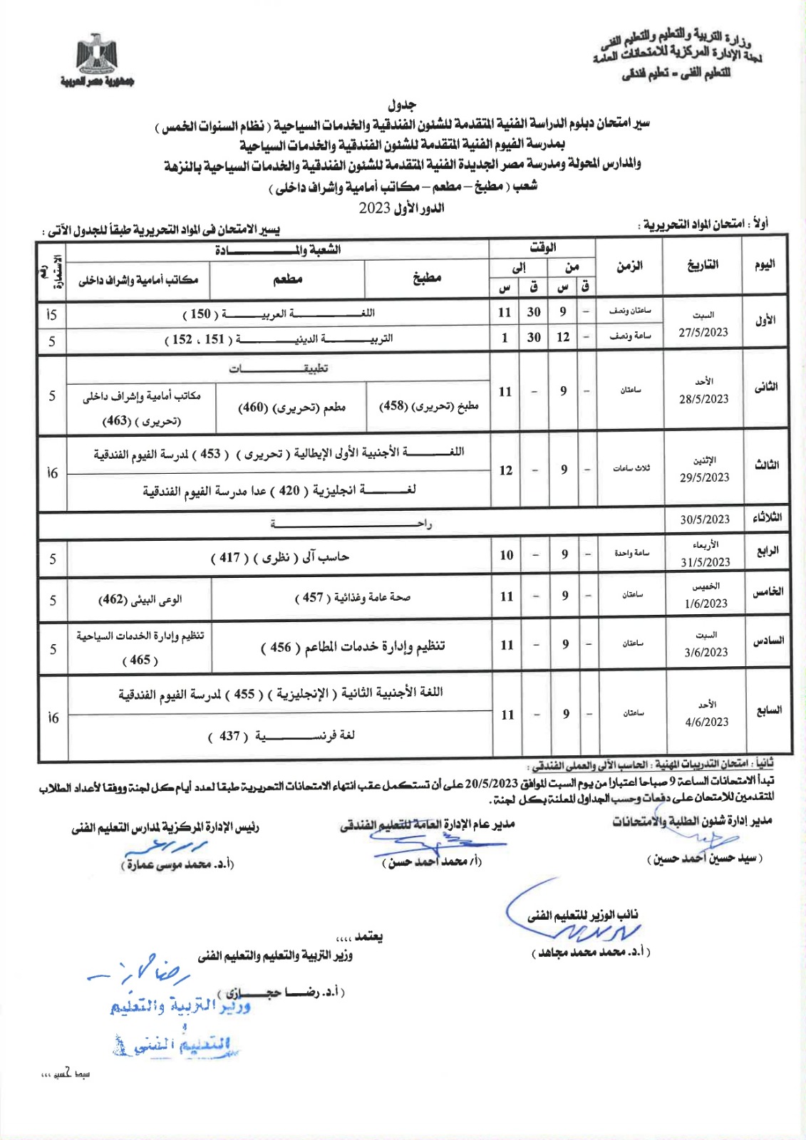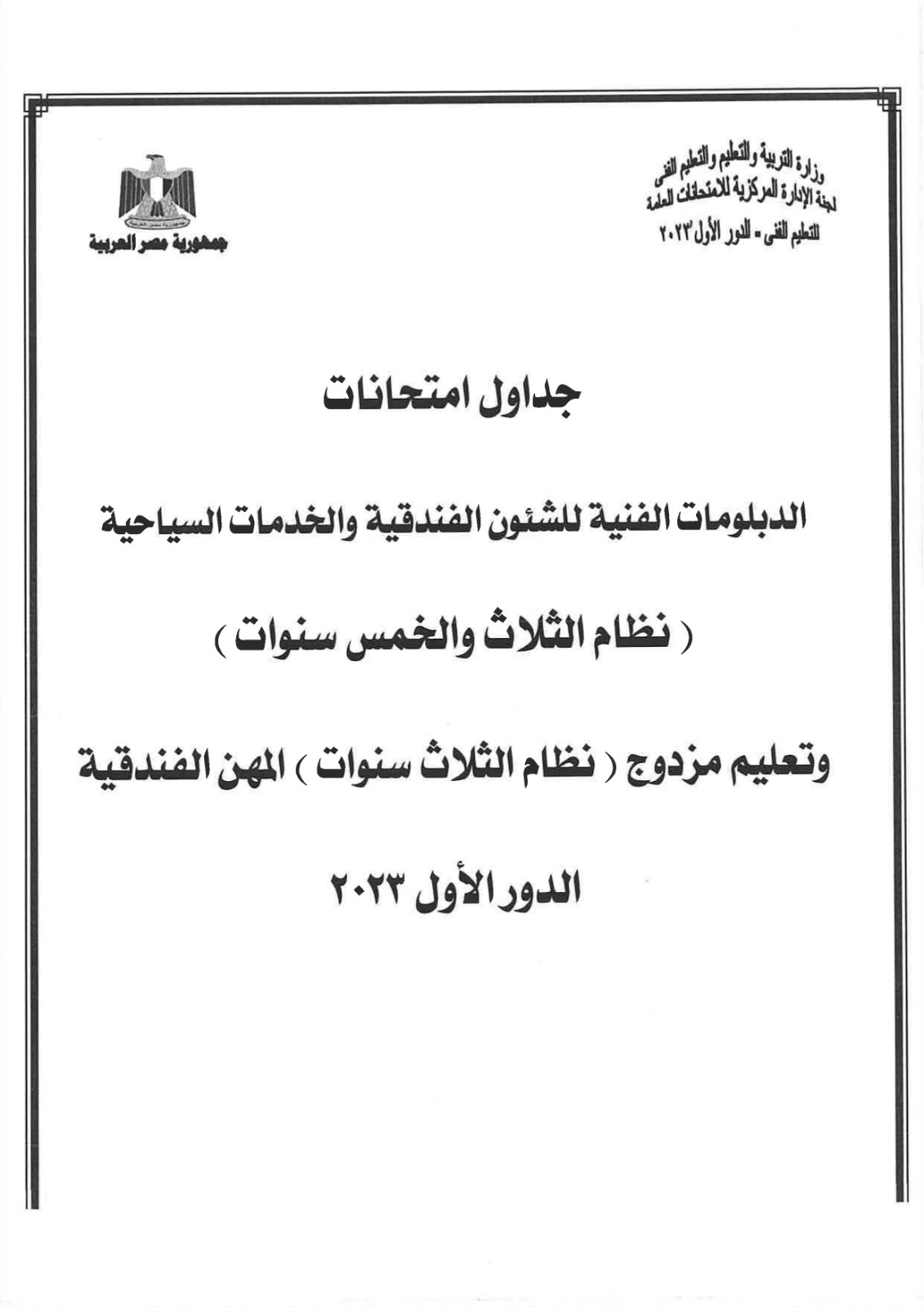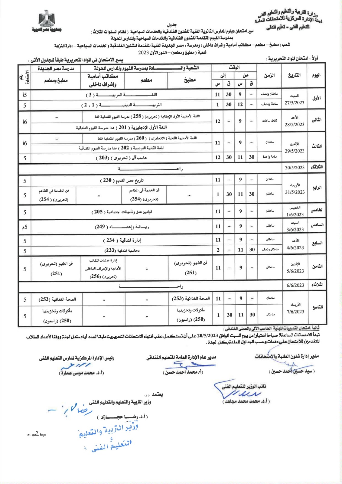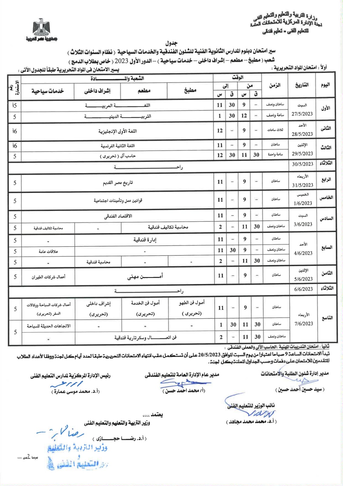 أعلنت لجنة الإدارة المركزية للامتحانات العامة، بوزارة التربية والتعليم، جداول امتحانات الدبلومات الفنية للشئون الفندقية والخدمات السياحية، نظام الـ 3 و5 سنوات، إلى جانب التعليم المزدوج نظام الـ 3 و5 سنوات، المهن الفندقية.