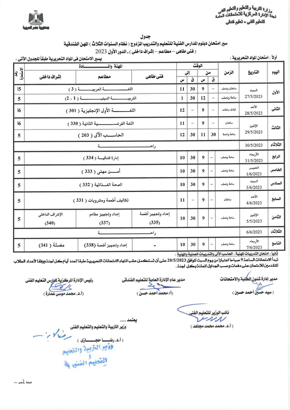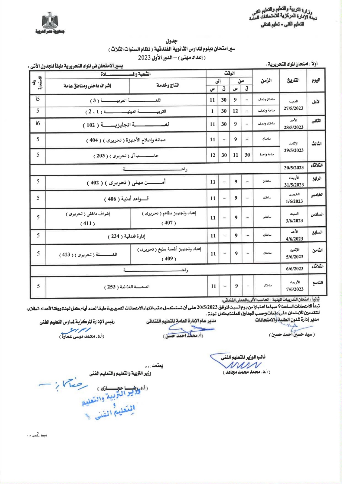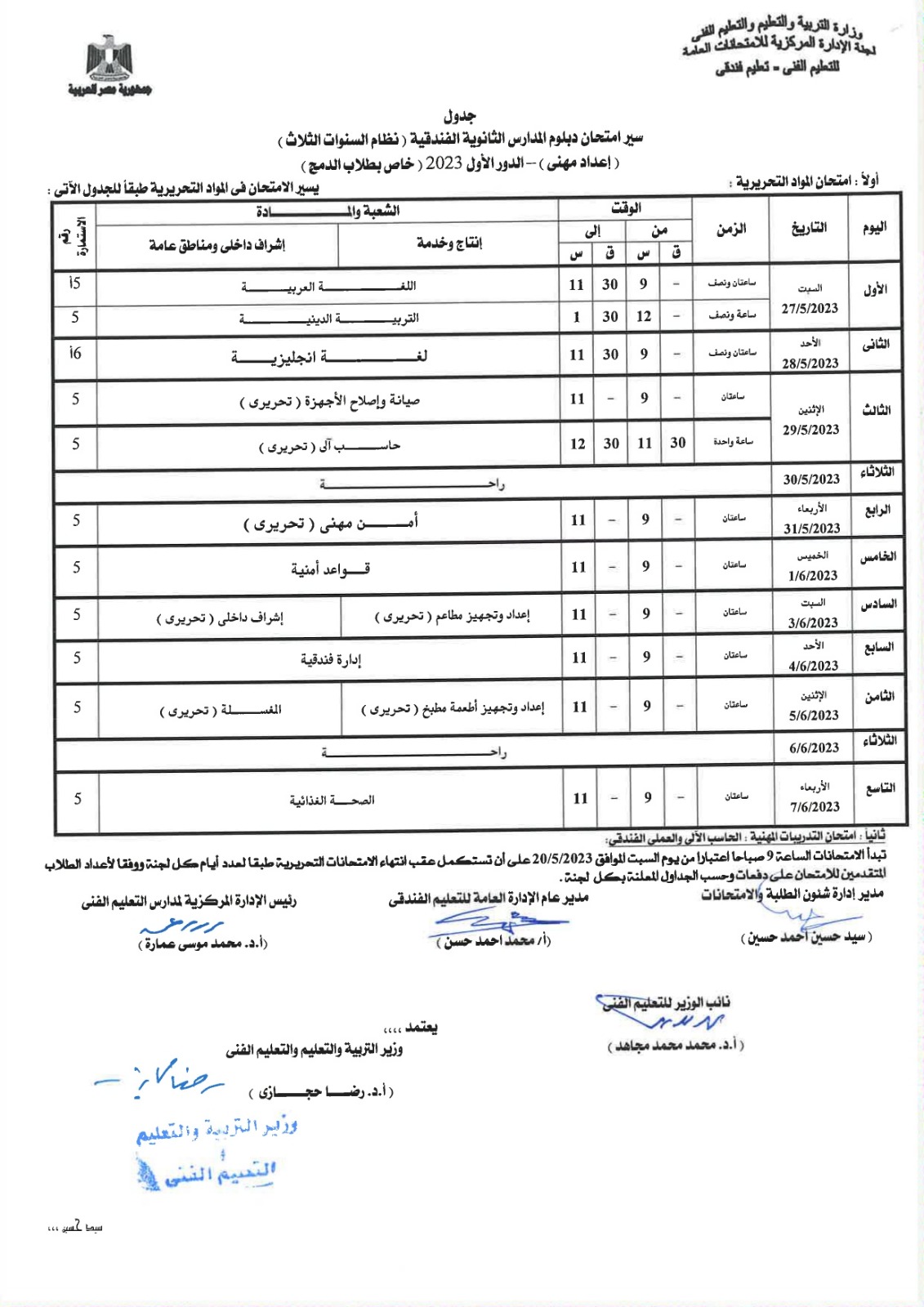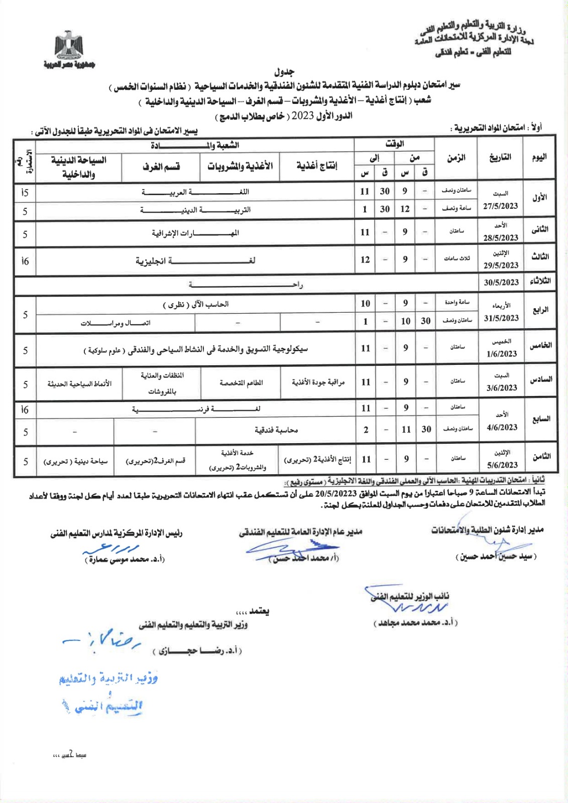 أعلنت لجنة الإدارة المركزية للامتحانات العامة، بوزارة التربية والتعليم، جداول امتحانات الدبلومات الفنية للشئون الفندقية والخدمات السياحية، نظام الـ 3 و5 سنوات، إلى جانب التعليم المزدوج نظام الـ 3 و5 سنوات، المهن الفندقية.