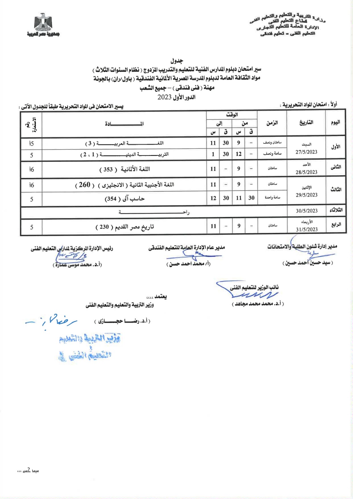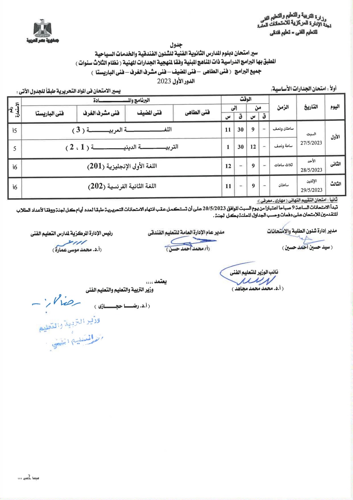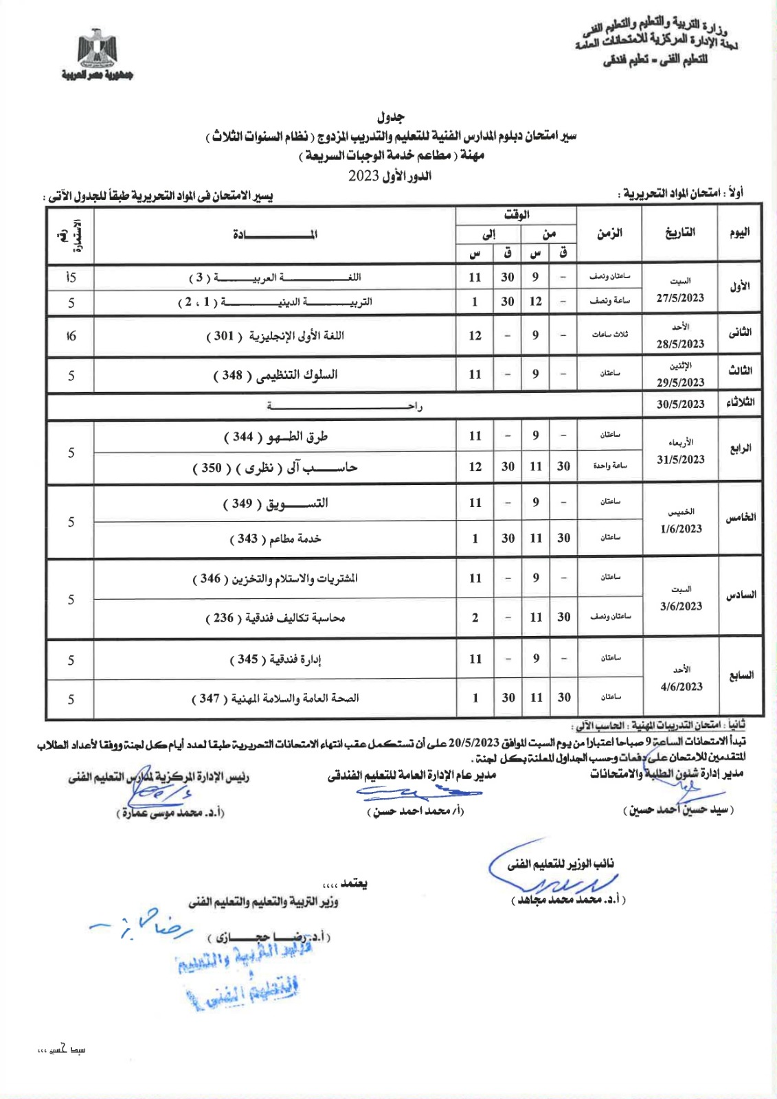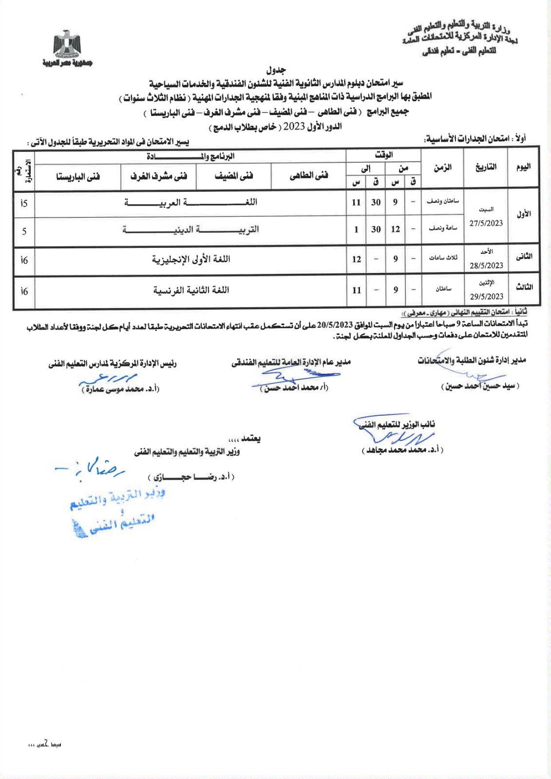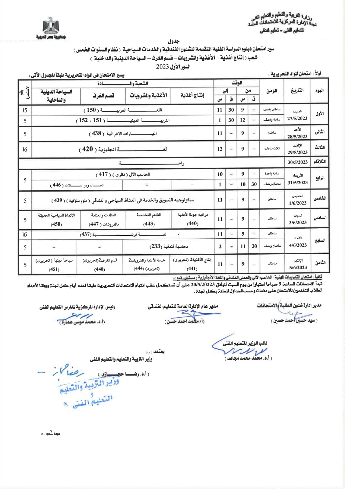 أعلنت لجنة الإدارة المركزية للامتحانات العامة، بوزارة التربية والتعليم، جداول امتحانات الدبلومات الفنية للشئون الفندقية والخدمات السياحية، نظام الـ 3 و5 سنوات، إلى جانب التعليم المزدوج نظام الـ 3 و5 سنوات، المهن الفندقية.