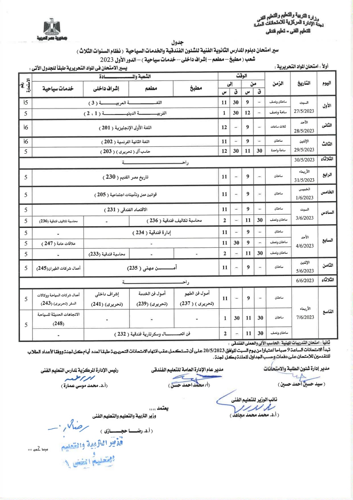 ننشر جداول امتحانات الدبلومات الفنية للشئون الفندقية والخدمات السياحية.. تبدأ 27 مايو