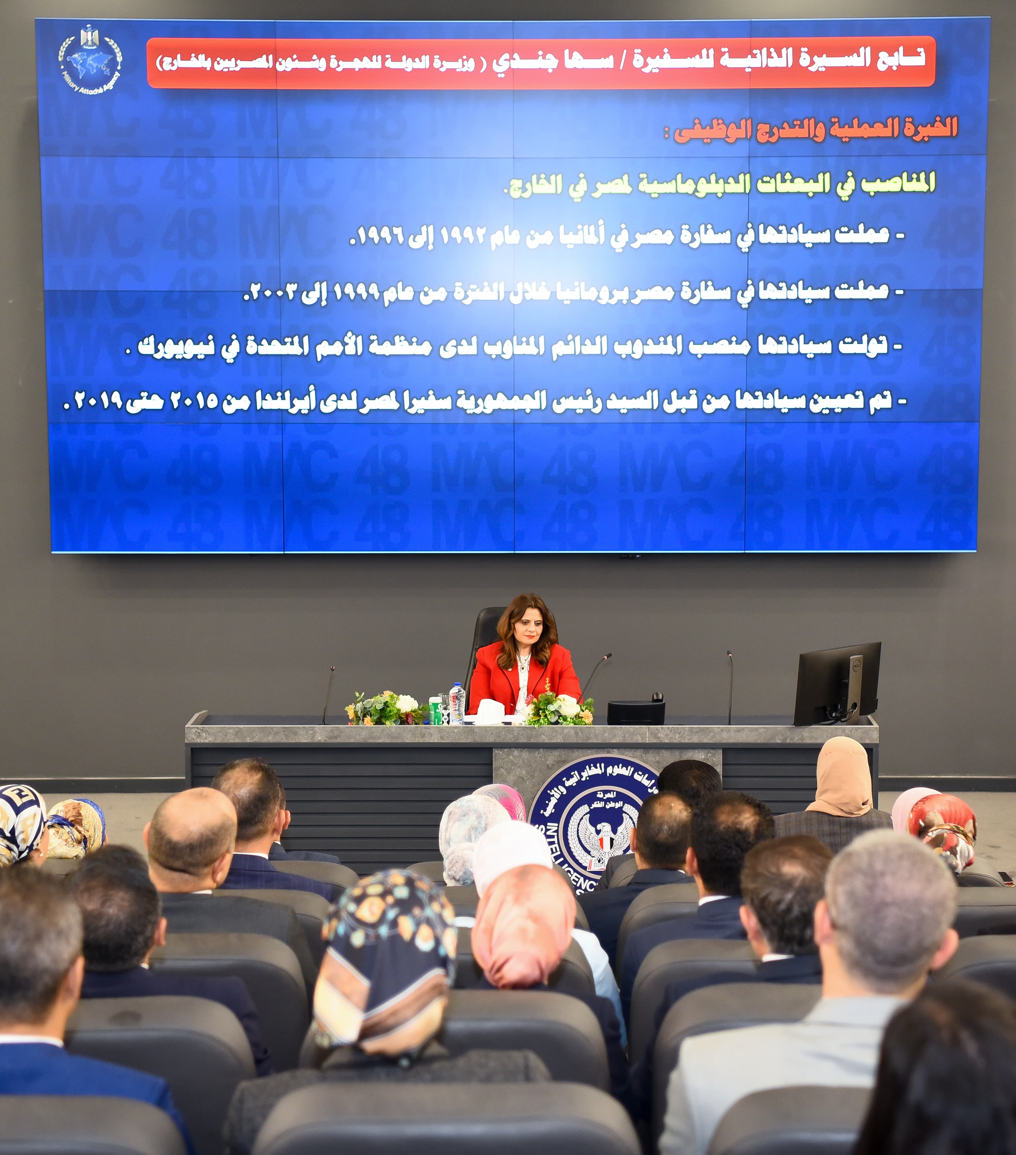 التقت السفيرة سها جندي، وزيرة الدولة للهجرة وشئون المصريين بالخارج، الملحقين العسكريين ممن سيلحقون كرؤساء ومساعدين لمكاتب الدفاع في الخارج قريباً، والذين تم اختيارهم للعمل بمكاتب التمثيل الدبلوماسى العسكري المصري بالخارج، في دورة التمثيل الدبلوماسي العسكري الـ48، ضمن ما تقوم به وزارة الدفاع من جهود لتوعية من يعمل بالسلك الدبلوماسي العسكري،