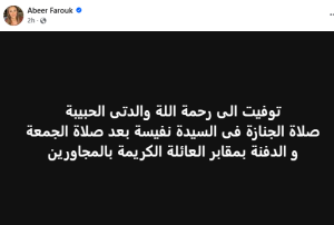 كتبت عبير فاروق في منشور عبر حسابها الرسمي بموقع فيس بوك: «توفيت الى رحمة الله والدتي الحبيبة».
