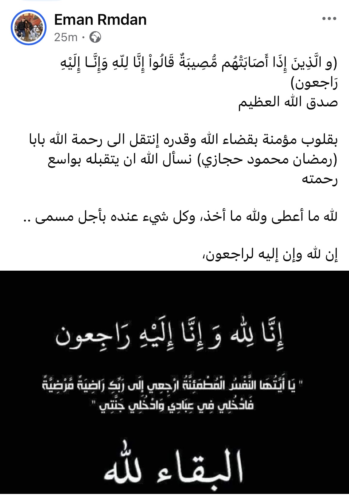 وأعلنت إيمان رمضان، شقيقة الفنان محمد رمضان، نبأ وفاة والدها عبر صفحتها الرسمية على موقع التواصل الاجتماعي “فيسبوك”، حيث كتبت قائلة:“(وَالَّذِينَ إِذَا أَصَابَتْهُم مُّصِيبَةٌ قَالُواْ إِنَّا لِلّهِ وَإِنَّا إِلَيْهِ رَاجِعُونَ) صدق الله العظيم.. بقلوب مؤمنة بقضاء الله وقدره انتقل إلى رحمة الله بابا (رمضان محمود حجازي)، نسأل الله أن يتقبله بواسع رحمته.. لله ما أعطى ولله ما أخذ، وكل شيء عنده بأجل مسمى.. إن لله وإن إليه راجعون.”